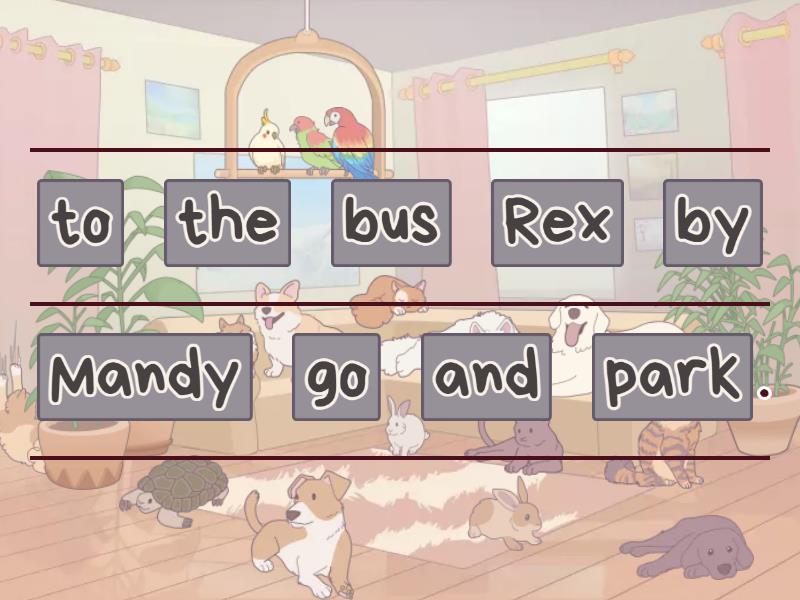 Rex and Mandy go to the park by bus., The mirror room is on the third floor., What can you do in the English room?, We mustn't litter in the classroom., I like playing in the jungle room.,