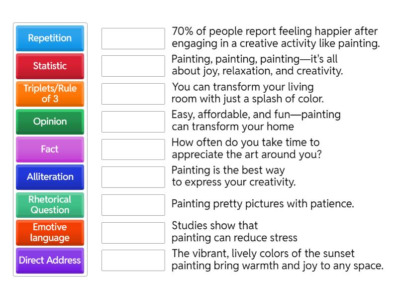 Alliteration - Painting pretty pictures with patience., Direct Address - You can transform your living room with just a splash of color., Fact - Studies show that painting can reduce stress, Rhetorical Question - How often do you take time to appreciate the art around you?, Triplets/Rule of 3 - Easy, affordable, and fun—painting can transform your home, Emotive language - The vibrant, lively colors of the sunset painting bring warmth and joy to any space., Statistic - 70% of people report feeling happier after engaging in a creative activity like painting., Opinion - Painting is the best way to express your creativity., Repetition - Painting, painting, painting—it's all about joy, relaxation, and creativity.,