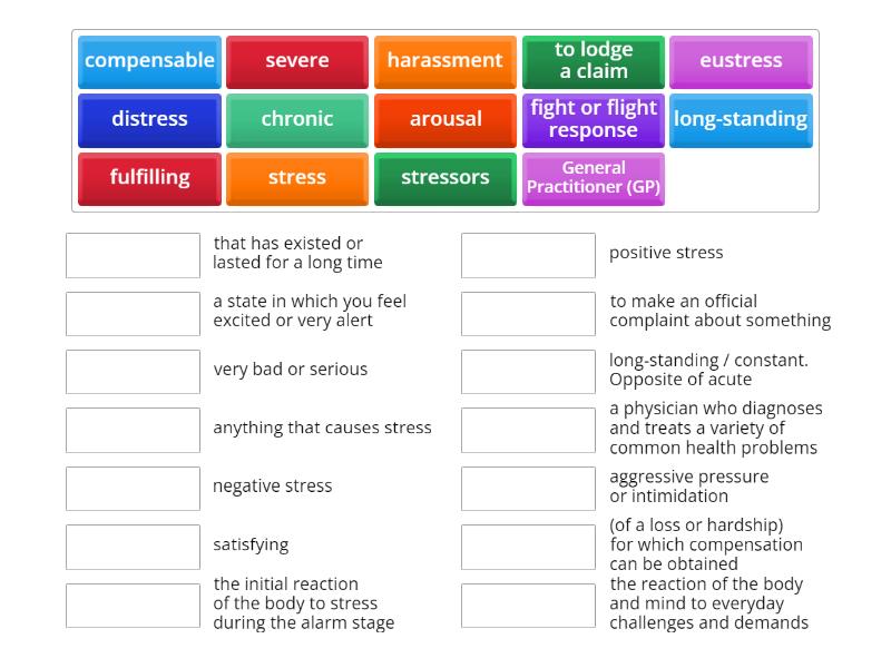 compensable - (of a loss or hardship) for which compensation can be obtained, eustress - positive stress, long-standing - that has existed or lasted for a long time, to lodge a claim - to make an official complaint about something, General Practitioner (GP) - a physician who diagnoses and treats a variety of common health problems, severe - very bad or serious, stress - the reaction of the body and mind to everyday challenges and demands, stressors - anything that causes stress, harassment - aggressive pressure or intimidation, fulfilling - satisfying, fight or flight response - the initial reaction of the body to stress during the alarm stage, distress - negative stress, chronic - long-standing / constant. Opposite of acute, arousal - a state in which you feel excited or very alert,