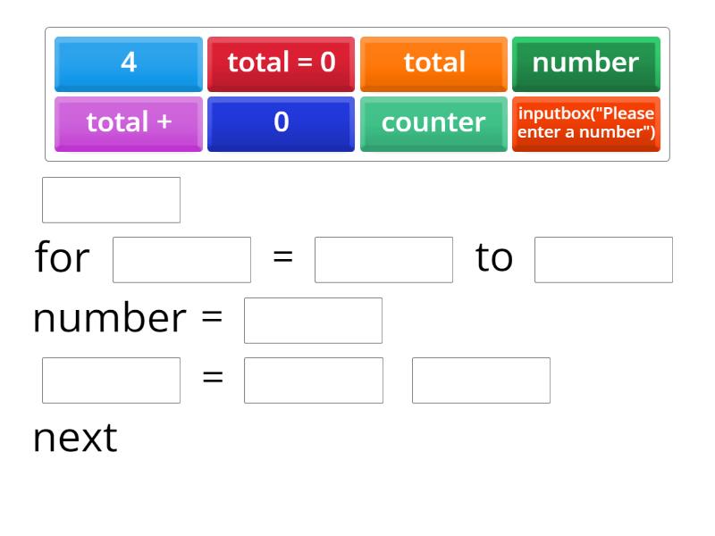 ____ for ____ = ____ to ____ number = ____ ____ = ____ ____ next ____ ____ ____ total ____ ____ ____ = ____ ____ ____ ____ number = inputbox ("Please enter a number") ____ ____ ____ ____ ____ ____