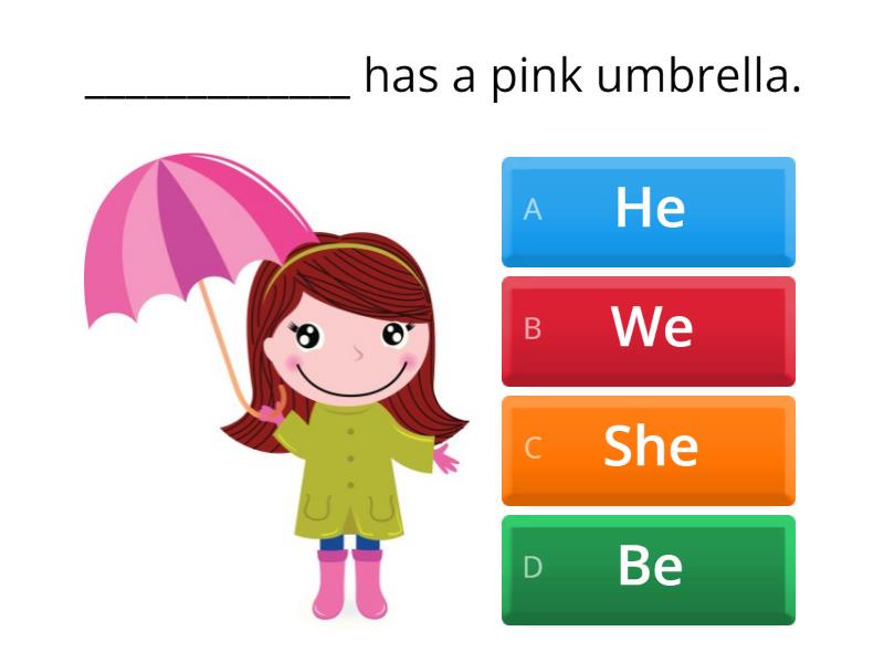 1) _____________ has a pink umbrella. a) He b) We c) She d) Be 2) It is Monday ____________. a) today b) day c) you d) full 3) "Stop!" __________ the man. a) were b) said c) one d) friend 4) ___________ are playing football. a) are b) is c) they d) play 5) This is our ___________. a) school b) friend c) house d) is 6) ___________ dog is sitting. a) Was b) Are c) So d) The 7) It _________ nice to have a ___________. a) nice b) is c) friend d) come 8) She __________ cold so _________ put her hat on. a) was b) there c) love d) she