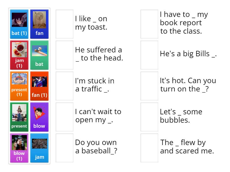 bat (1) - The _ flew by and scared me., bat - Do you own a baseball_?, blow (1) - Let’s _ some bubbles., blow - He suffered a _ to the head., fan (1) - He’s a big Bills _., fan - It’s hot. Can you turn on the _?, jam (1) - I like _ on my toast., jam - I’m stuck in a traffic _., present (1) - I can’t wait to open my _., present - I have to _ my book report to the class.,