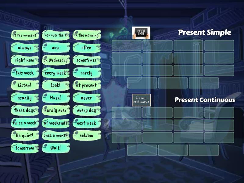 Present Simple: always, usually, often, seldom, rarely, sometimes, hardly ever, never, on Wednesday, every day, in the morning, every week, twice a week, once a month, at weekends, Present Continuous: now, right now, at the moment, these days, this week, tomorrow, Be quiet!, Look!, Listen!, Wait!, Look over there!, next week, Hush!, at present,