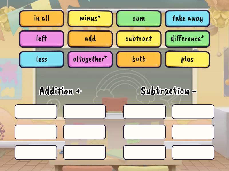 Addition +: plus, in all, add, both, sum, altogether*, Subtraction -: take away, less, left, subtract, difference*, minus*,