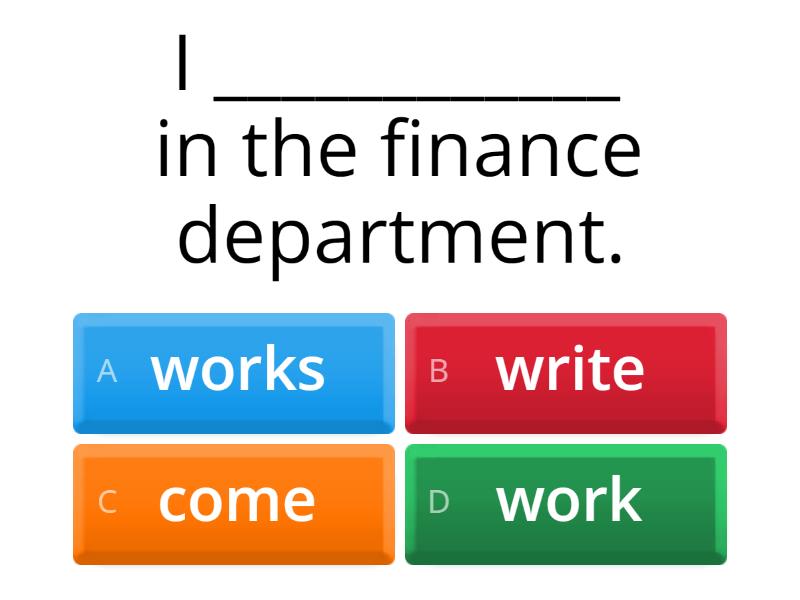 1) I ____________ in the finance department. a) works b) write c) come d) work 2) You ____________ the company's social media account. a) write b) delete c) manage d) manages 3) She ___________ clients every Monday. a) visits b) meets c) meet d) talk 4) Our company ____________ electronics equipment. a) provide b) produce c) produces d) provides 5) We ________ our emails every morning. a) checks b) deletes c) writes d) check 6) I ____________________ on weekends. a) doesn't work b) don't work c) doesn't works d) don't works 7) She ___________________________ the HR department. a) doesn't manages b) don't manage c) doesn't manage d) don't manages 8) They ______________ a meeting on Friday. a) doesn't have b) don't haves c) doesn't has d) don't have 9) Our team _____________________ International accounts. a) doesn't handle b) don't handle c) doesn't handles d) don't handles 10) He _________________________ his e-mails after 6PM. a) don't check b) doesn't check c) don't checks d) no check 11) ______________ you ___________ in marketing? a) Do_________work b) Does_________ work c) Does__________ works d) Do ____________ works 12) _________________ she ______________ the new project ? a) Does_____________ manages b) Does ___________ manage c) Do______________ manage d) Do____________ manages 13) ____________ they ____________ this Thursday? a) Does ____________ meet b) Does___________ meets c) Do __________ meet d) Do _____________ meets 14) __________________ our team ____________ customer support? a) Does________________ handle b) Does_____________ handles c) Do________________ handles d) Do______________ handle 15) Do you work from Monday to Friday? a) Yes, I work. b) Yes, you work. c) Yes, I do. d) Yes, work. 16) Does he have his own office? a) Yes, he do. b) Yes, he has. c) Yes, he does. d) Yes, he have. 17) Do I have time for a break? a) No, I don't. b) No, we have not. c) No , you don't d) Yes, break time! 18) Do they come here every morning? a) No, they don't b) Yes, they come. c) No, they come not. d) No, they come. 19) Does your company produce cars? a) Yes, it produces. b) No, it not produces. c) Yes, it does. d) No, we don't 20) Does our company have a lot of employees ? a) Yes, it does. b) No, it doesn't have. c) Yes, it has. d) No, it hasn't