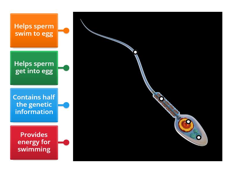 Contains half the genetic information, Provides energy for swimming, Helps sperm swim to egg, Helps sperm get into egg.