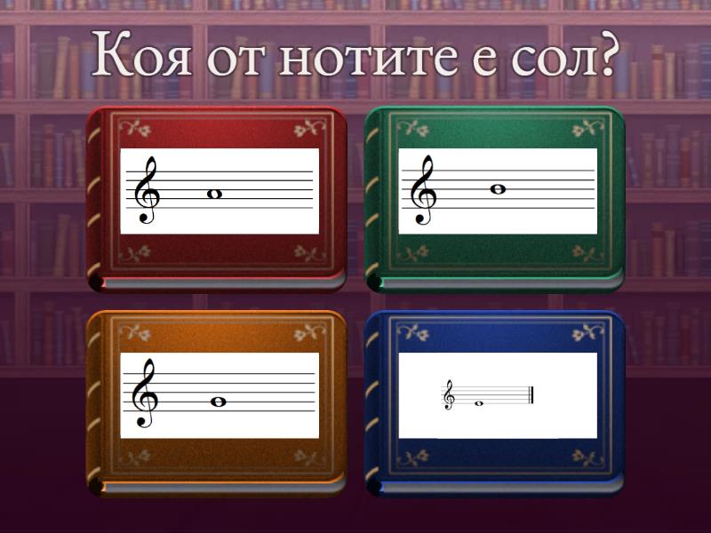 1) Коя от нотите е сол? a) b) c) d) 2) Какъв е този символ? a) ключ b) тон c) нота d) мелодия 3) Колко времена звучи половината нота? a) Едно b) Две c) Три d) Четири 4) Коя пауза е цяла? a) b) 5) Коя е тази нота? a) До b) Ре c) Ми d) Сол 6) Коя тонова трайност звучи в продължение на един мах (половин време)? a) Половина b) Четвъртина c) Осмима d) Цяла 7) С какво са свързани тези ноти? a) Ченгел b) Опашка c) Ребро d) Байракче 8) На колко осмини е равна четвъртина нота с точка? a) Две b) Три c) Четири d) Осем