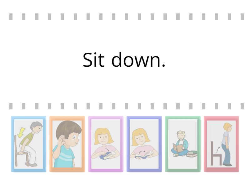 Sit down., Stand up., Listen!, Read., Close the book., Open the book.,