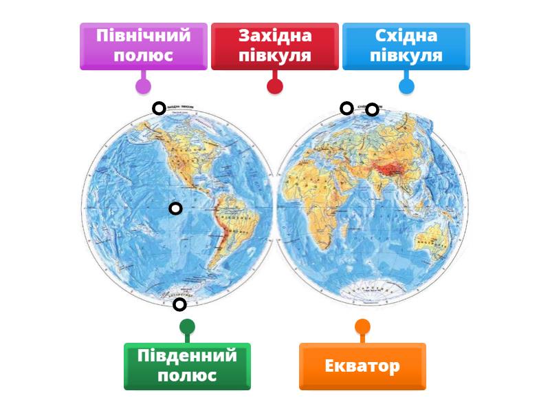 Східна півкуля, Західна півкуля, Екватор, Південний полюс, Північний полюс.