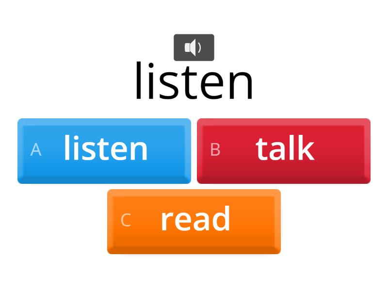 1) listen a) listen b) talk c) read 2) listen a) fisten b) listen c) lizten 3) talk a) listen b) read c) talk 4) talk a) talk b) falk c) takl 5) read a) write b) read c) talk 6) read a) dear b) fead c) read 7) write a) write b) read c) talk 8) write a) wite b) write c) vrite