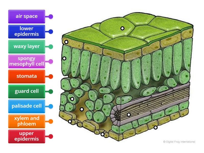 palisade cell, upper epidermis, xylem and phloem, guard cell, spongy mesophyll cell, lower epidermis, waxy layer, stomata, air space.