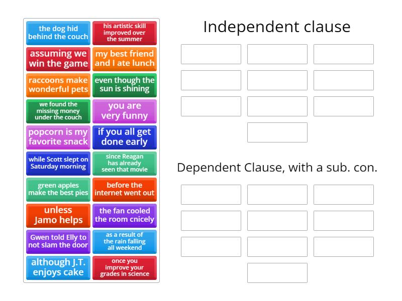 Independent clause: we found the missing money under the couch, green apples make the best pies, my best friend and I ate lunch, his artistic skill improved over the summer, the fan cooled the room cnicely, Gwen told Elly to not slam the door, the dog hid behind the couch, you are very funny, raccoons make wonderful pets, popcorn is my favorite snack, Dependent Clause, with a sub. con.: since Reagan has already seen that movie, once you improve your grades in science, while Scott slept on Saturday morning, as a result of the rain falling all weekend, even though the sun is shining, before the internet went out, if you all get done early, unless Jamo helps, assuming we win the game , although J.T. enjoys cake,