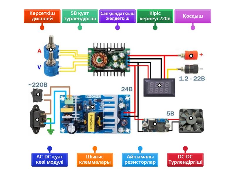 Айнымалы резисторлар, DC-DC Түрлендіргіші, Шығыс клеммалары, Кіріс кернеуі 220в, Қосқыш, AC-DC қуат көзі модулі, 5В қуат түрлендіргіш, Көрсеткіш дисплей , Салқындатқыш желдеткіш.
