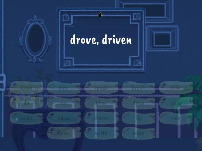 drive - drove, driven, ride - rode, ridden, rise - rose, risen, write - wrote, written, bite - bit, bitten, hide - hid, hidden, break - broke, broken, choose - chose, chosen, speak - spoke, spoken, wake - woke, woken, blow - blew, blown, grow - grew, grown, know - knew, known, fly - flew, flown, draw - drew, drawn, show - showed, shown, do - did, done, come - came, come,