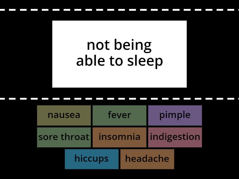 insomnia - not being able to sleep, fever - high body temperature, hiccups - a repeated sound in your throat, often from eating too quickly, nausea - a feeling that what’s in your stomach will come up, indigestion - pain in the stomach because of something you have eaten, pimple - a small raised spot on the skin, headache - a pain in your head, sore throat - a general feeling of pain in the throat,