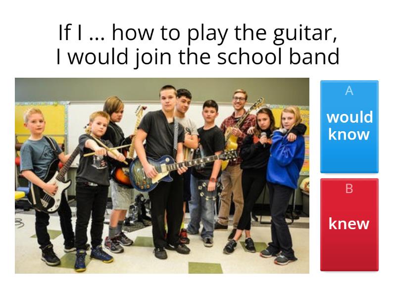 1) If I ... how to play the guitar, I would join the school band a) would know b) knew 2) If the TV worked, Karen ... the movie a) watched b) would watch 3) My parents would be fit if they ... . a) exercised b) would exercise 4) If Kate ... over 16 she would become a volunteer. a) would be b)   c) were 5) If Tom didn't have to work overtime he ... the event. a) visited b) would visit 6) If I ... a lot of money, I would travel around the world. a) have b) had c) were having 7) Emily says that if she ... Brad Pitt, she would get his autograph. a) met b) meet c) would meet 8) If Ronald lived in Spain for 5 years, he  ... Spanish. a) learned b) would learn