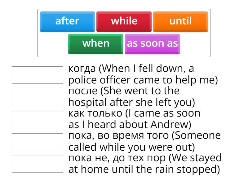 as soon as - как только (I came as soon as I heard about Andrew), until - пока не, до тех пор (We stayed at home until the rain stopped), after - после (She went to the hospital after she left you), when - когда (When I fell down, a police officer came to help me), while - пока, во время того (Someone called while you were out),