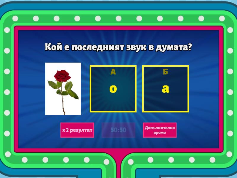 1) Кой е последният звук в думата? a) о b) а 2) Коя е предпоследната буква в думата? a) и b) о c) н d) м e) л 3) Колко букви има думата? a) 5 b) 4 c) 6 d) 7 e) 8 4) Колко звука има думата? a) 7 b) 8 c) 5 d) 6 e) 9 5) Кои са гласните букви в думата? a) р,ъ b) д,р,о c) ъ,о d) в,о e) в,ъ f) в,р 6) С кой звук започва думата? a) н b) л c) о d) а e) б 7) Кои букви се повтарят 2 пъти в думата? a) у,р b) е,п c) п,у d) д,е e) р,е 8) Колко звука има думата? a) 4 b) 3 c) 2 9) Кой звук се чува в края на думата? a) р b) а c) у d) б e) к f) в 10) На кое място в думата се намира буквата ,,Б"? a) 1 b) 2 c) 3 d) 4
