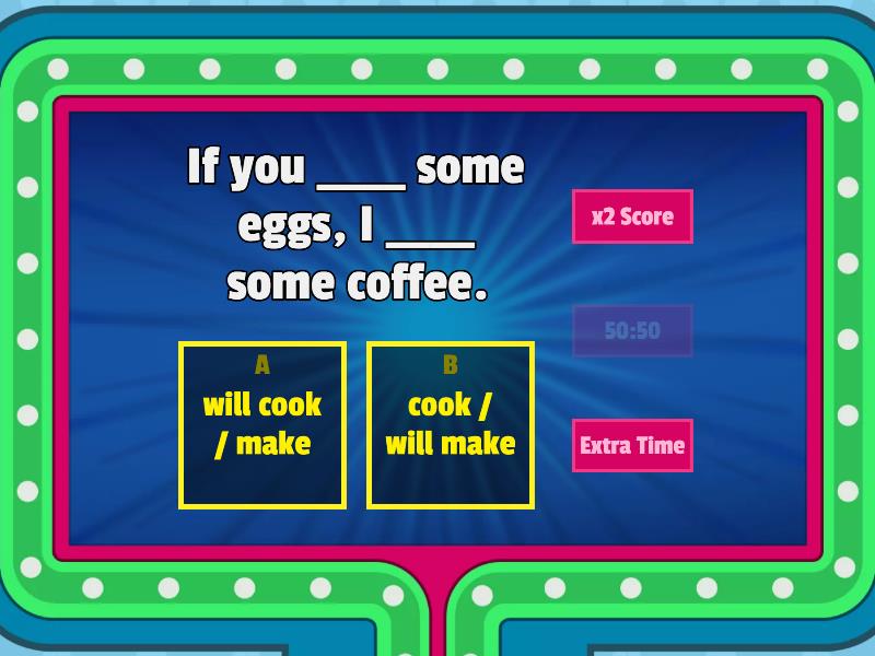 1) If you ____ some eggs, I ____ some coffee. a) will cook / make b) cook / will make 2) My brother _____ his car this afternoon if he ____ enough time. a) will wash / has b) wash / will have 3) James _____ some books if he _____ to the library. a) will borrow / goes b) borrow / will go 4) If I ____ more money, I _____ a bank machine. a) need / will find b) will need / find 5) Sarah ____ a doctor if she still ____ sick tomorrow. a) sees / will feel b) will see / feels 6) We ____ a movie if we ____ bored. a) watch / will feel b) will watch / feel 7) If our class ____ early, I _____ home and study. a) finishes / will go b) will finish / go 8) If the weather ____ nice tomorrow, we _____ to the beach. a) is / will go b) will be / go 9) If our teacher ____ another test on Monday, I ____ happy. a) will give / am not happy b) gives / will not be 10) I _____ a headache if I ____ to more of that loud music! a) will have / listen b) have / will listen