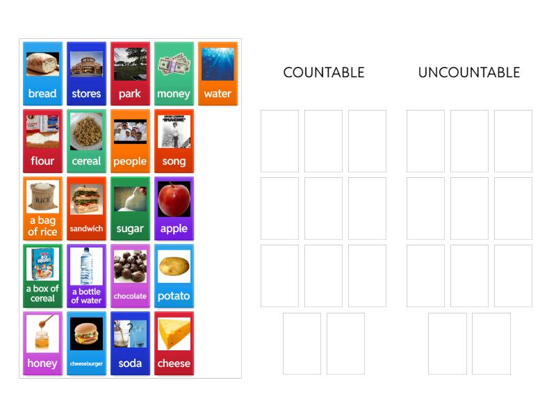 COUNTABLE: apple, sandwich, cheeseburger, potato, people, park, song , stores, a bag of rice, a bottle of water, a box of cereal, UNCOUNTABLE: sugar, water , bread, cheese, soda, money, honey, cereal, chocolate, flour,