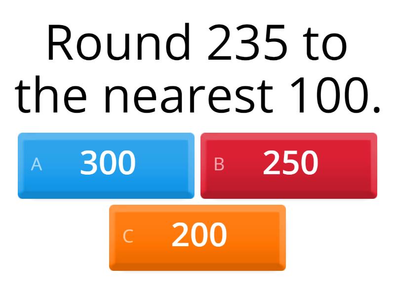 1) Round 235 to the nearest 100. a) 300 b) 250 c) 200 2) Round 751 to the nearest 100. a) 600 b) 700 c) 800 3) Round 57 to the nearest 100. a) 0 b) 50 c) 100 4) Round 367 to the nearest 100. a) 100 b) 200 c) 300 d) 400 5) Round 89 to the nearest 100. a) 100 b) 0 c) 800 d) 900 6) Round 178 to the nearest 100. a) 200 b) 800 c) 700 d) 100 7) Round 825 to the nearest 100. a) 800 b) 900 c) 200 d) 300 8) Round 218 to the nearest 100. a) 0 b) 200 c) 300 d) 100 9) Round 111 to the the nearest 100. a) 11 b) 200 c) 100 d) 111 10) Round 301 to the nearest 100. a) 200 b) 300 c) 100 d) 400