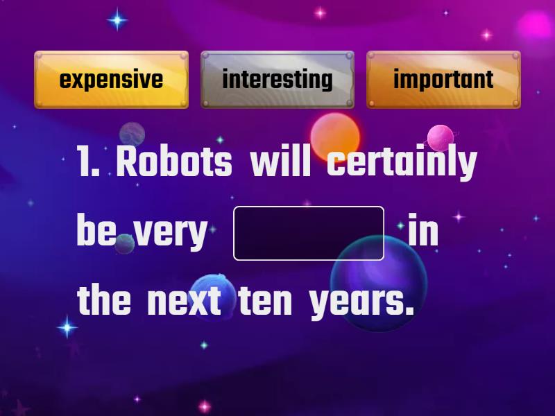 1. Robots will certainly be very ____ in the next ten years. 2. Computers will be important in education, but robots won’t be very ____ teachers. 3. These small robots will probably be very ____ at first, but after ten years, a tiny robot doctor will be normal! 4. Robots in some areas, like war or police work, will possibly be ____ to people. 5. I hope he’ll be ____ to work soon.