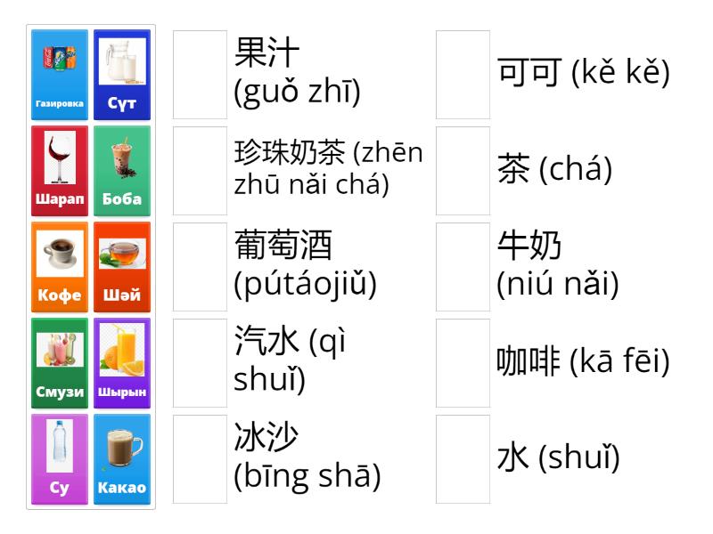 Су - 水 (shuǐ), Шырын - 果汁 (guǒ zhī), Какао - 可可 (kě kě), Шәй - 茶 (chá), Кофе - 咖啡 (kā fēi), Сүт - 牛奶 (niú nǎi), Газировка - 汽水 (qì shuǐ), Смузи - 冰沙 (bīng shā), Шарап - 葡萄酒 (pútáojiǔ), Боба - 珍珠奶茶 (zhēn zhū nǎi chá),
