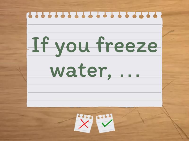 If it rains, …, If you mix blue and yellow, …, If water boils, …, If you leave ice in the sun, …, If you press this button, …, If you exercise regularly, …, If plants don’t get sunlight, …, If you don’t drink water, …, If you add sugar to coffee, …, If the fire alarm rings, …, If you freeze water, …, If the power goes out, …, If you eat too much, …, If this class finishes earlier, …, If people don’t sleep well, …,