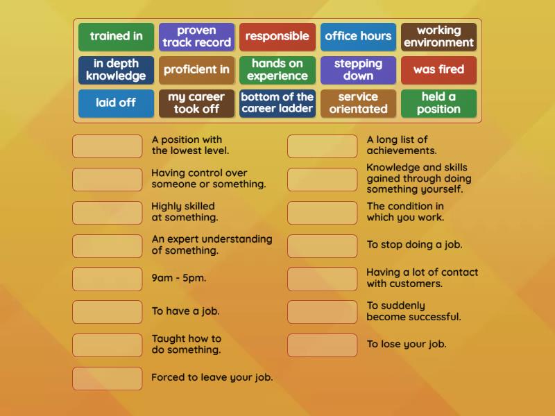 proven track record - A long list of achievements., proficient in - Highly skilled at something., service orientated - Having a lot of contact with customers., trained in - Taught how to do something., in depth knowledge - An expert understanding of something., responsible - Having control over someone or something., office hours - 9am - 5pm., held a position - To have a job., laid off - To lose your job., was fired - Forced to leave your job., my career took off - To suddenly become successful., hands on experience - Knowledge and skills gained through doing something yourself., working environment - The condition in which you work., bottom of the career ladder - A position with the lowest level., stepping down - To stop doing a job.,