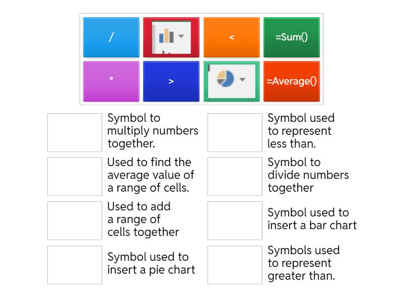 =Average() - Used to find the average value of a range of cells., =Sum() - Used to add a range of cells together, * - Symbol to multiply numbers together., / - Symbol to divide numbers together, > - Symbols used to represent greater than., < - Symbol used to represent less than., Symbol used to insert a pie chart, Symbol used to insert a bar chart,