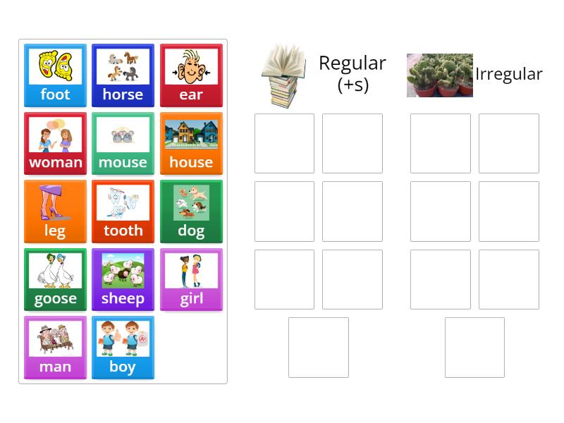 Regular (+s): boy, girl, dog, horse, leg, ear, house, Irregular: man, woman, goose, sheep, foot, tooth, mouse,
