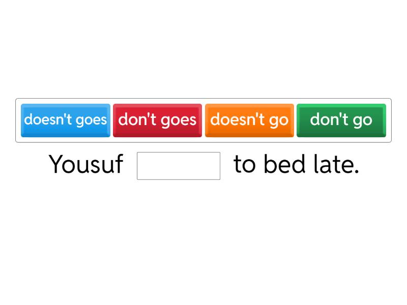 Yousuf ____ to bed late. My uncle ____ the internet. She ____ lunch with my family. He ____ friends on Sunday. My cousin ____ TV in the morning. Caterina ____ on Thursday. My phone ____ anymore. That sentence ____ sense.