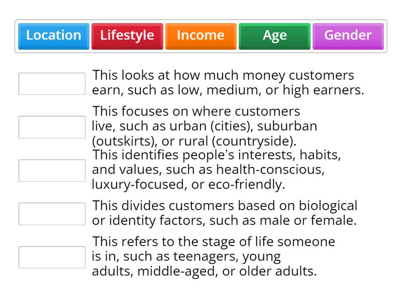 Age - This refers to the stage of life someone is in, such as teenagers, young adults, middle-aged, or older adults., Gender - This divides customers based on biological or identity factors, such as male or female., Income - This looks at how much money customers earn, such as low, medium, or high earners., Location - This focuses on where customers live, such as urban (cities), suburban (outskirts), or rural (countryside)., Lifestyle - This identifies people’s interests, habits, and values, such as health-conscious, luxury-focused, or eco-friendly.,