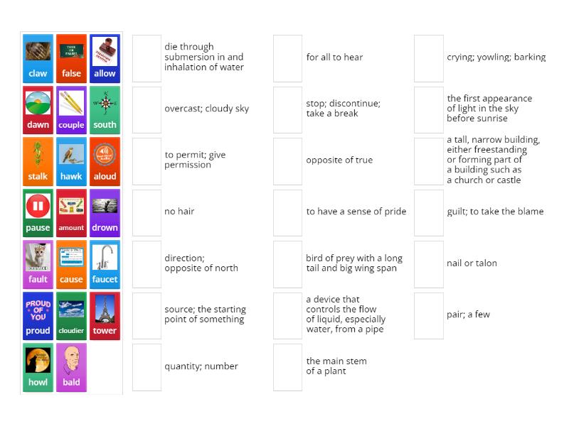 aloud - for all to hear, bald - no hair, hawk - bird of prey with a long tail and big wing span, south - direction; opposite of north, faucet - a device that controls the flow of liquid, especially water, from a pipe, proud - to have a sense of pride, claw - nail or talon, tower - a tall, narrow building, either freestanding or forming part of a building such as a church or castle, stalk - the main stem of a plant, couple - pair; a few, howl - crying; yowling; barking, false - opposite of true, dawn - the first appearance of light in the sky before sunrise, allow - to permit; give permission, drown - die through submersion in and inhalation of water, pause - stop; discontinue; take a break, fault - guilt; to take the blame, cause - source; the starting point of something, amount - quantity; number, cloudier - overcast; cloudy sky,