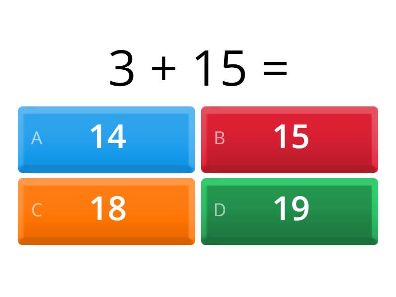 1) 3 + 15 = a) 14 b) 15 c) 18 d) 19 2) 2 + 5 = a) 3 b) 5 c) 7 d) 9 3) 5 + 8 = a) 11 b) 12 c) 13 d) 14 4) 3 + 4 = a) 1 b) 7 c) 8 d) 11 5) 9 - 3 = a) 7 b) 6 c) 12 d) 11 6) 2 - 0 = a) 1 b) 2 c) 6 d) 18 7) 10 - 5 = a) 5 b) 6 c) 4 d) 0 8) 20-10 = a) 11 b) 10 c) 9 d) 12