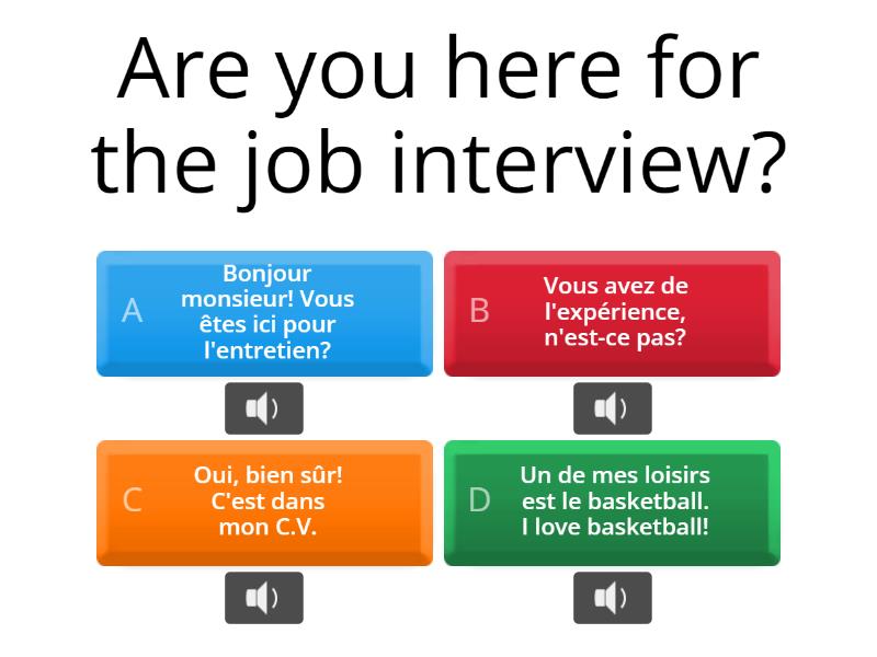 1) Are you here for the job interview? a) Bonjour monsieur! Vous êtes ici pour l'entretien? b) Vous avez de l'expérience, n'est-ce pas? c) Oui, bien sûr! C'est dans mon C.V. d) Un de mes loisirs est le basketball. I love basketball! 2) Yes, good morning. Nice to meet you! a) Pourquoi voulez-vous travailler ici? b) Oui, bien sûr! C'est dans mon C.V. c) Oui, bonjour madame. Enchanté! d) Je parle français, anglais et un peu d'espagnol. 3) Come with me, please. It's over here. a) Venez avec moi, s'il vous plaît! b) Merci madame. Au revoir! c) Vous avez de l'expérience, n'est-ce pas? d) J'ai dix-sept ans. Je suis français et américain. 4) Of course! I'll follow you. a) Bien sûr ! Je vous suis. b) Merci! Voici mon C.V. ! c) Venez avec moi, s'il vous plaît! d) Je suis un élève au Lycée-le-Grand à Paris. 5) Please sit down! a) Oui, bien sûr! C'est dans mon C.V. b) Très bien! Je m'appelle Stéphane Mouren. c) Pourquoi voulez-vous travailler ici? d) Asseyez-vous, je vous en prie! 6) Thank you. Here is my résumé! a) Merci! Voici mon C.V. ! b) Eh bien! Parlez-moi de vous! c) Très bien! On va vous contacter! d) Oui, bien sûr! C'est dans mon C.V. 7) Tell me about yourself. a) Eh bien! Parlez-moi de vous! b) Pourquoi voulez-vous travailler ici? c) Un de mes loisirs est le basketball. I love basketball! d) Je parle français, anglais et un peu d'espagnol. 8) Very well. My name is Stéphane Mouren. a) Oui, bonjour madame. Enchanté! b) Bien sûr ! Je vous suis. c) Je suis un élève au Lycée-le-Grand à Paris. d) Très bien! Je m'appelle Stéphane Mouren. 9) I am 17 years old. I am French and American. a) Oui, bien sûr! C'est dans mon C.V. b) J'ai dix-sept ans. Je suis français et américain. c) Très bien! Je m'appelle Stéphane Mouren. d) Je veux être médecin. 10) I speak French, English and a little Spanish. a) Je parle français, anglais et un peu d'espagnol. b) Très bien! Je m'appelle Stéphane Mouren. c) Je peux commencer tout de suite. d) Oui, bonjour madame. Enchanté! 11) I'm a student at Lycée-le-Grand in Paris. a) Eh bien! Parlez-moi de vous! b) Pourquoi voulez-vous travailler ici? c) Bonjour monsieur! Vous êtes ici pour l'entretien? d) Je suis un élève au Lycée-le-Grand à Paris. 12) I love History, Math and Chemistry. a) Eh bien! Parlez-moi de vous! b) Merci madame. Au revoir! c) Quand est-ce que vous pouvez commencer? d) J'aime l'histoire, les maths et la chimie. 13) I want to be a doctor. a) Très bien! On va vous contacter! b) Vous avez de l'expérience, n'est-ce pas? c) Je veux être médecin. d) Venez avec moi, s'il vous plaît! 14) One of my hobbies is basketball. I love basketball! a) Eh bien! Parlez-moi de vous! b) Eh bien, je veux travailler ici parce que j'aime parler aux gens. c) Un de mes loisirs est le basketball. I love basketball! d) Je peux commencer tout de suite. 15) Why do you want to work here? a) Pourquoi voulez-vous travailler ici? b) Venez avec moi, s'il vous plaît! c) J'aime l'histoire, les maths et la chimie. d) Asseyez-vous, je vous en prie! 16) Well, I would like to work here because I love talking to people. a) Eh bien, je veux travailler ici parce que j'aime parler aux gens. b) Très bien! Je m'appelle Stéphane Mouren. c) J'aime l'histoire, les maths et la chimie. d) Je veux être médecin. 17) You do have experience, don't you? a) Oui, bonjour madame. Enchanté! b) Merci! Voici mon C.V. ! c) Vous avez de l'expérience, n'est-ce pas? d) Eh bien, je veux travailler ici parce que j'aime parler aux gens. 18) Yes, of course! It's in my résumé. a) Bonjour monsieur! Vous êtes ici pour l'entretien? b) Bien sûr ! Je vous suis. c) Oui, bien sûr! C'est dans mon C.V. d) Eh bien! Parlez-moi de vous! 19) When can you start? a) Merci! Voici mon C.V. ! b) Je parle français, anglais et un peu d'espagnol. c) Quand est-ce que vous pouvez commencer? d) Un de mes loisirs est le basketball. I love basketball! 20) I can start right away. a) Eh bien! Parlez-moi de vous! b) Très bien! Je m'appelle Stéphane Mouren. c) Je peux commencer tout de suite. d) Très bien! On va vous contacter! 21) Very good! We will contact you. Thank you! a) Pourquoi voulez-vous travailler ici? b) Eh bien! Parlez-moi de vous! c) Très bien! On va vous contacter! d) Très bien! Je m'appelle Stéphane Mouren. 22) Thank you. Goodbye! a) Merci madame. Au revoir! b) J'aime l'histoire, les maths et la chimie. c) Eh bien, je veux travailler ici parce que j'aime parler aux gens. d) Oui, bien sûr! C'est dans mon C.V.