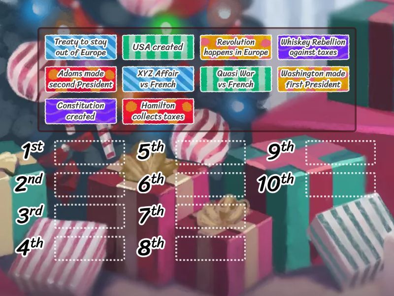 USA created, Constitution created, Washington made first President, Hamilton collects taxes, Whiskey Rebellion against taxes, Revolution happens in Europe, Treaty to stay out of Europe, Adams made second President, XYZ Affair vs French, Quasi War vs French.