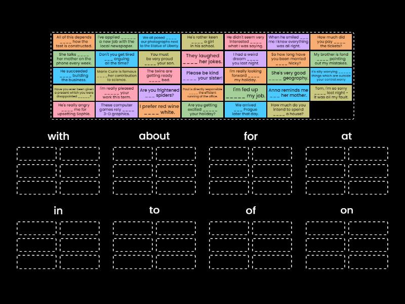 with: He's really angry ____ me for upsetting Sophie., Have you ever been given a present which you were disappointed _____?, I'm fed up _____ my job., I'm really pleased _____ your work this term., about: I had a weird dream ____ you last night., It's silly worrying _____ things which are outside your control.worry, Are you getting excited _____ your holiday?, Tom, I'm so sorry ____ last night - it was all my fault., for: I've applied _____ a new job with the local newspaper., How much did you pay ____ the tickets?, We all posed ____ our photographs next to the Statue of Liberty., Marie Curie is famous ____her contribution to science., The twins are getting ready ____ bed., Paul is directly responsible ____ the efficient running of the office., at: They laughed ____ her jokes., When he smiled ___ me I knew everything was all right., She's very good ____ geography., in: We arrived ___ Prague later that day., He succeeded ____ building the business., He didn't seem very interested ____ what I was saying., to: I'm really looking forward ____ my holiday., I prefer red wine ____ white., She talks ____ her mother on the phone every week., Please be kind ____ your sister!, So how long have you been married ____ Nicky?, of: Anna reminds me ___ her mother., My brother is fond ____ pointing out my mistakes., Are you frightened ___ spiders?, You must be very proud ____ your son., Don't you get tired ___ arguing all the time?, on: All of this depends ____ how the test is constructed., These computer games rely ____ 3-D graphics., How much do you intend to spend ____ a house?, He's rather keen ____ a girl in his school.,