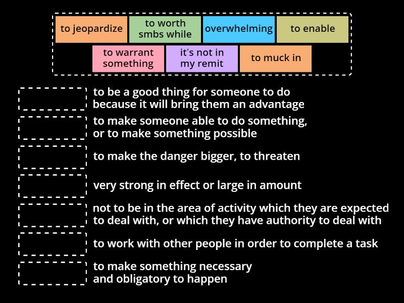 to warrant something - to make something necessary and obligatory to happen, overwhelming - very strong in effect or large in amount, to enable - to make someone able to do something, or to make something possible, to worth smbs while - to be a good thing for someone to do because it will bring them an advantage, to muck in - ​to work with other people in order to complete a task, it’s not in my remit - not to be in the area of activity which they are expected to deal with, or which they have authority to deal with, to jeopardize - to make the danger bigger, to threaten,