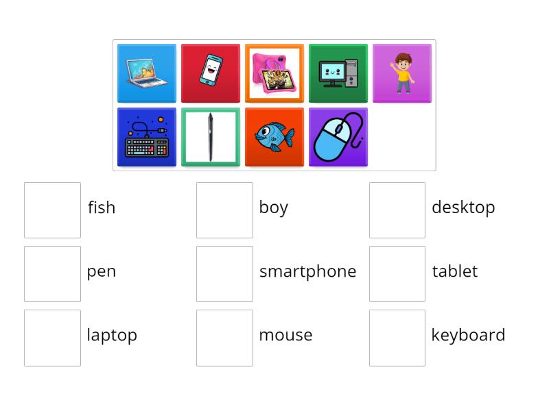 desktop, laptop, smartphone, tablet, mouse, keyboard, pen, boy, fish,