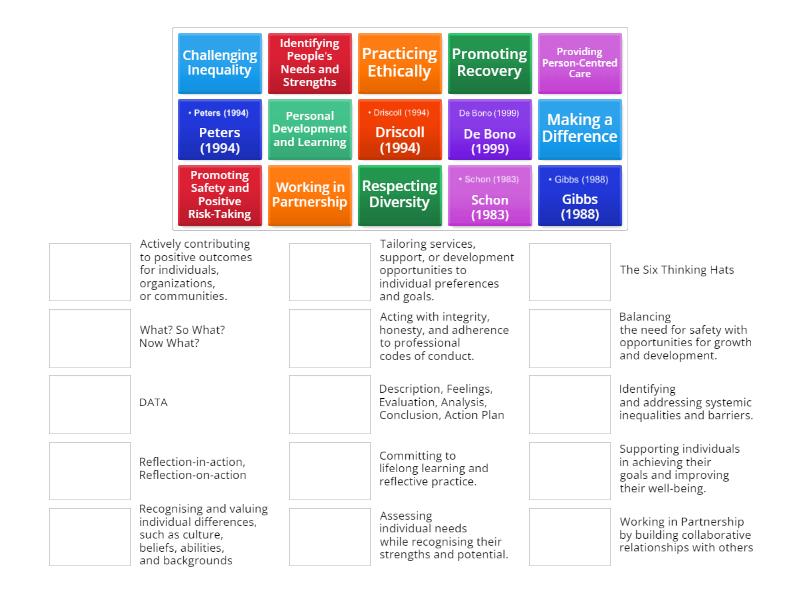 Working in Partnership - Working in Partnership by building collaborative relationships with others, Respecting Diversity - Recognising and valuing individual differences, such as culture, beliefs, abilities, and backgrounds, Practicing Ethically - Acting with integrity, honesty, and adherence to professional codes of conduct., Challenging Inequality - Identifying and addressing systemic inequalities and barriers., Promoting Recovery - Supporting individuals in achieving their goals and improving their well-being., Identifying People’s Needs and Strengths - Assessing individual needs while recognising their strengths and potential., Providing Person-Centred Care - Tailoring services, support, or development opportunities to individual preferences and goals., Making a Difference - Actively contributing to positive outcomes for individuals, organizations, or communities., Promoting Safety and Positive Risk-Taking - Balancing the need for safety with opportunities for growth and development., Personal Development and Learning - Committing to lifelong learning and reflective practice., Schon (1983) - Reflection-in-action, Reflection-on-action, Gibbs (1988) - Description, Feelings, Evaluation, Analysis, Conclusion, Action Plan, Driscoll (1994) - What? So What? Now What? , Peters (1994) - DATA, De Bono (1999) - The Six Thinking Hats,