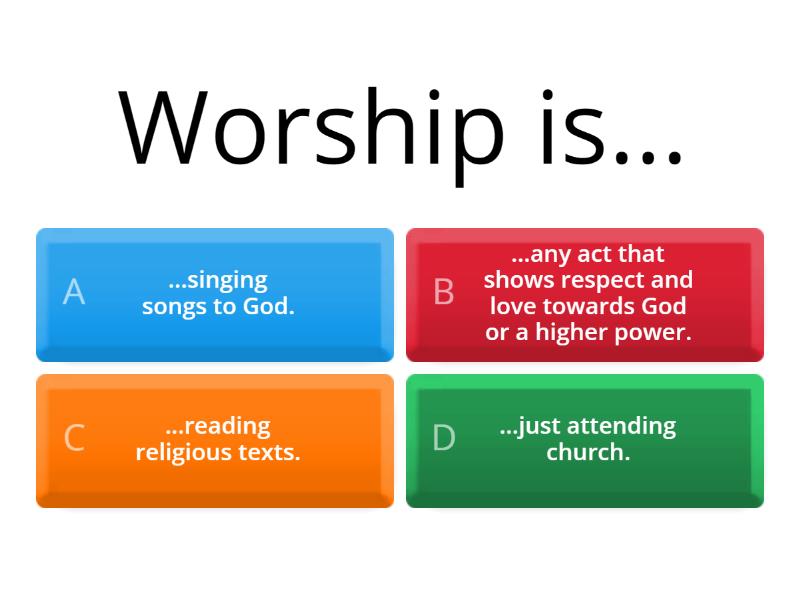 1) Worship is... a) ...singing songs to God. b) ...any act that shows respect and love towards God or a higher power. c) ...reading religious texts. d) ...just attending church. 2) Liturgical worship is... a) ...a spontaneous form of worship with no set structure. b) ...worship done privately at home. c) ...a type of worship that follows a set pattern or ritual, often involving prayers and readings. d) ...worship that uses technology like videos and music. 3) Non-liturgical worship is... a) ...worship that happens in a public place. b) ...a structured type of worship with a clear format. c) ...worship that does not follow a set structure and is often more flexible. d) ...worship that happens only during special festivals. 4) Informal worship is... a) ...worship that strictly follows church traditions. b) ...worship done in total silence. c) ...worship led only by a priest. d) ...worship in small groups, often spontaneous and relaxed. 5) Private worship is... a) ...a worship that takes place at specific holy sites. b) ...worship done alone, often personal and reflective. c) ...worship conducted through online services. d) ...a type of liturgical worship. 6) Rituals are... a) ...repeated actions with symbolic meanings. b) ...a type of spontaneous worship. c) ...reading stories from religious texts. d) ...personal prayers said before bed. 7) Sacraments are... a) ...a form of Christian music used in worship. b) ...actions performed during informal worship. c) ...specific religious ceremonies believed to impart God’s grace. d) ...a type of blessing given by priests. 8) Christians worship to... a) ...fulfill a religious obligation. b) ...learn more about the Bible. c) ...connect with God, thank him, and strengthen their faith. d) ...meet other members of the church.