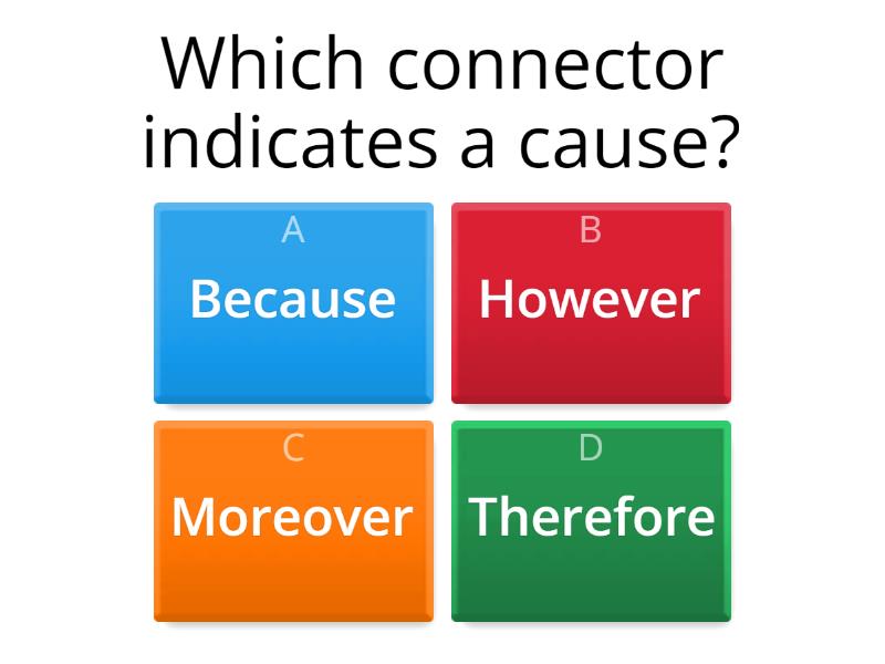 1) Which connector indicates a cause? a) Because b) However c) Moreover d) Therefore 2) Select the effect connector. a) Thus b) Although c) Unless d) Since 3) Which connector does NOT show contrast? a) But b) Yet c) So d) Nevertheless 4) Identify the sequence connector. a) Firstly b) Similarly c) Likewise d) Consequently