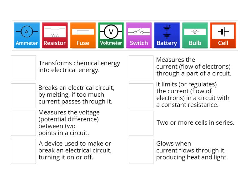 Bulb - Glows when current flows through it, producing heat and light., Voltmeter - Measures the voltage (potential difference) between two points in a circuit., Ammeter - Measures the current (flow of electrons) through a part of a circuit., Resistor - It limits (or regulates) the current (flow of electrons) in a circuit with a constant resistance., Cell - Transforms chemical energy into electrical energy., Battery - Two or more cells in series., Fuse - Breaks an electrical circuit, by melting, if too much current passes through it., Switch - A device used to make or break an electrical circuit, turning it on or off.,