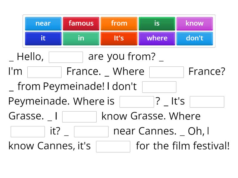 _ Hello, ____ are you from? _ I'm ____ France. _ Where ____ France? _ from Peymeinade! I don't ____ Peymeinade. Where is ____? _ It's ____ Grasse. _ I ____ know Grasse. Where ____ it? _ ____ near Cannes. _ Oh, I know Cannes, it's ____ for the film festival!