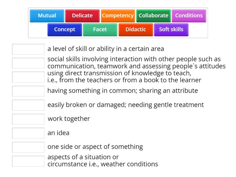 Didactic - using direct transmission of knowledge to teach, i.e., from the teachers or from a book to the learner, Delicate - easily broken or damaged; needing gentle treatment, Mutual - having something in common; sharing an attribute, Concept - an idea, Collaborate - work together, Facet - one side or aspect of something, Conditions - aspects of a situation or circumstance i.e., weather conditions, Soft skills - social skills involving interaction with other people such as communication, teamwork and assessing people`s attitudes, Competency - a level of skill or ability in a certain area,