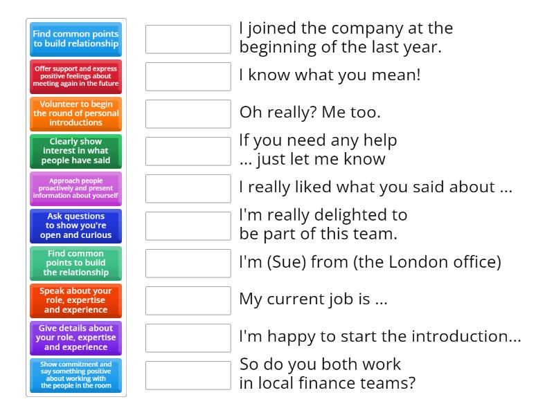 Clearly show interest in what people have said - I really liked what you said about ... , Volunteer to begin the round of personal introductions - I'm happy to start the introduction..., Approach people proactively and present information about yourself - I'm (Sue) from (the London office), Find common points to build the relationship - Oh really? Me too., Give details about your role, expertise and experience - My current job is ..., Offer support and express positive feelings about meeting again in the future - If you need any help ... just let me know, Ask questions to show you're open and curious - So do you both work in local finance teams?, Find common points to build relationship - I know what you mean!, Speak about your role, expertise and experience - I joined the company at the beginning of the last year., Show commitment and say something positive about  working with the people in the room - I'm really delighted to be part of this team.,