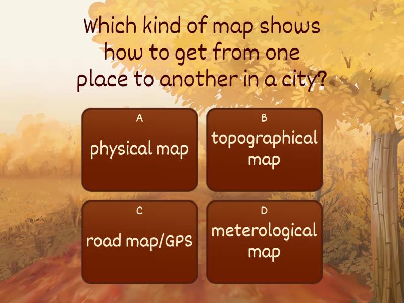 1) Which kind of map shows how to get from one place to another in a city? a) physical map b) topographical map c) road map/GPS d) meterological map 2) What is this called? a) map draft b) compass c) legend d) grid 3) How many states are in the US? a) 35 b) 75 c) 48 d) 50 4) How many countries have English as a first official language? a) 100 b) 16 c) 67 d) 76 5) What do we call the part of the US that is on the ocean?  a) water b) coast c) island d) capital 6) What kind of map shows landforms such as mountains, rivers and lakes? a) physical map b) topographical map c) road map/GPS d) meterological map