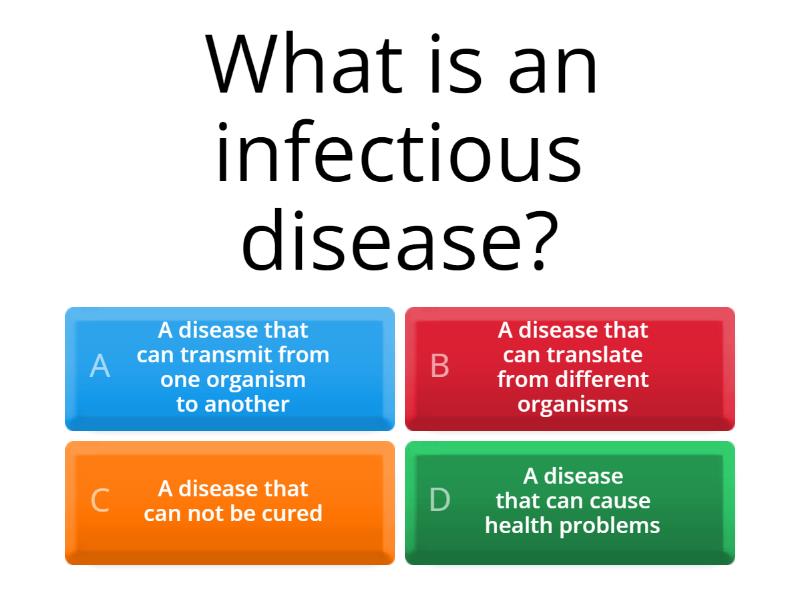 1) What is an infectious disease? a) A disease that can transmit from one organism to another b) A disease that can translate from different organisms c) A disease that can not be cured d) A disease that can cause health problems 2) What is the definition of a pathogen? a) A disease b) A disease-causing plant c) A disease-causing animal d) A disease-causing microorganism 3) The following is not a type of pathogen a) Protists b) Bacteria c) Parasite d) Virus 4) How can you spread viruses a) air b) water c) contact d) all of the above 5) Colds are caused by: a) Bacteria b) Fungi c) Getting too cold d) Viruses 6) Ten people became sick with the flu after attending a school dance. What is the scenario that would best explain how the sick people got sick? a) contact with infected person b) contact with infected animal c) contact with contaminated object d) contact with environmental sources 7) Flu, the Common cold and COVID 19 are caused by a) Viruses b) Bacteria c) fungi d) Protists 8) The signs of a disease are known as its: a) Symptoms b) Diagnosis c) Microbes d) Problems 9) Which of the following statement is true? a) Viruses are microscopic and living b) Host cells are living cells c) Viruses do not attack a specific host cell d) An example of a virus is strep throat e) 10) A vaccine contains: a) A dead or weakened pathogen b) Any active pathogen c) Microbes