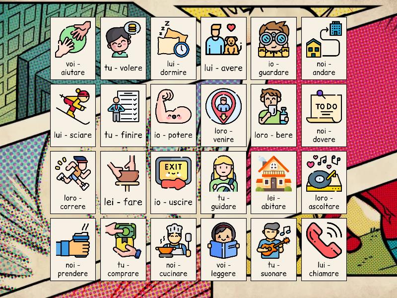 io - guardare - guardo, tu - comprare - compri, lei - abitare - abita, noi - prendere - prendiamo, voi - aiutare - aiutate, loro - correre - corrono, lui - dormire - dorme, tu - guidare - guidi, lui - sciare - scia, noi - cucinare - cuciniamo, voi - leggere - leggete, tu - suonare - suoni, loro - ascoltare - ascoltano, lui - chiamare - chiama, tu - volere - vuoi, lei - fare - fa, noi - andare - andiamo, loro - bere - bevono, io - uscire - esco, io - potere - posso , noi - dovere - dobbiamo, tu - finire - finisci, lui - avere - ha, loro - venire - vengono,